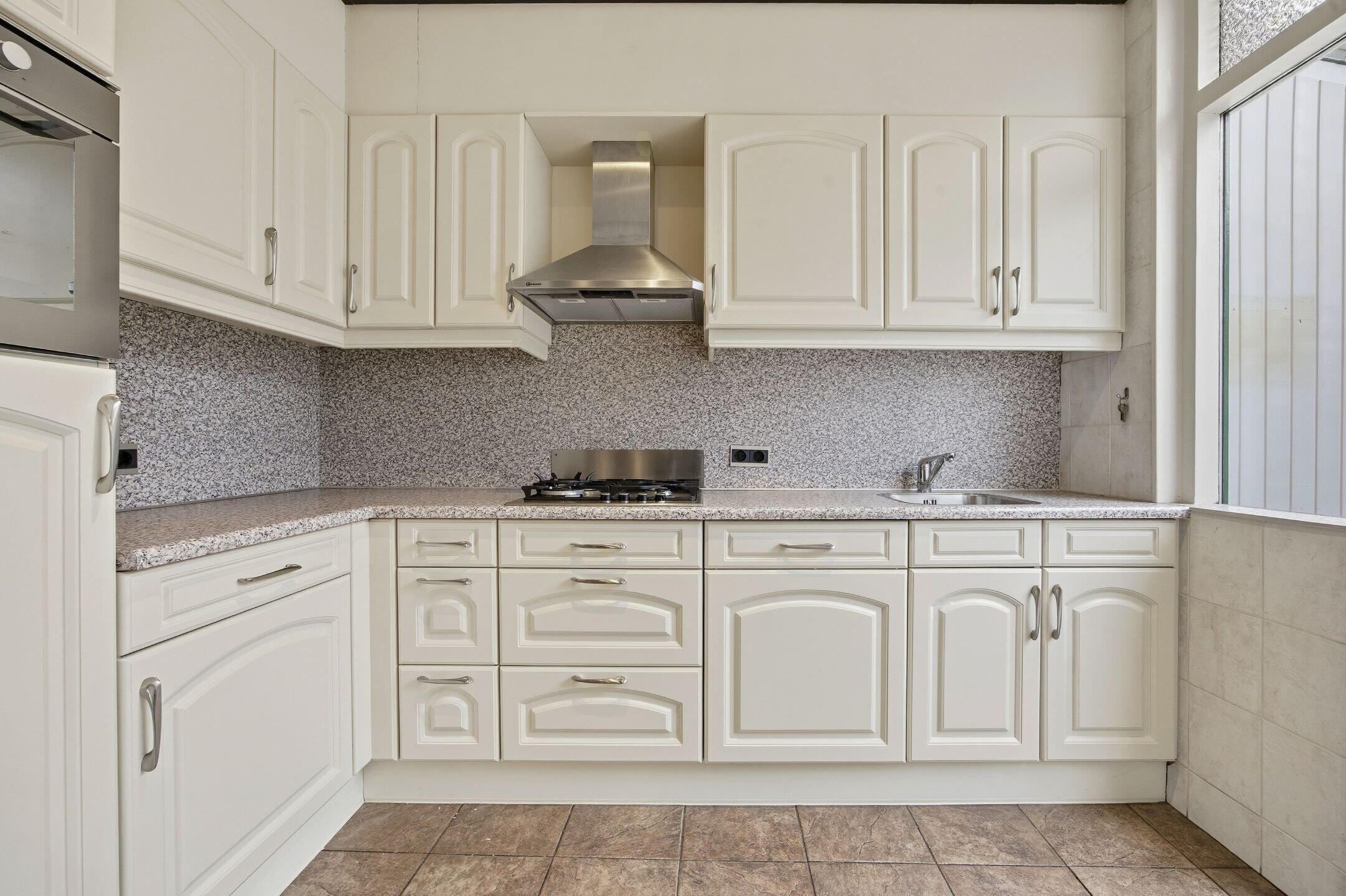 De semi-open keuken beschikt over een loopdeur naar de serre en is uitgerust met diverse inbouwapparatuur, waaronder een gaskookplaat, vaatwasser, oven, spoelbak en rvs-afzuigkap.
