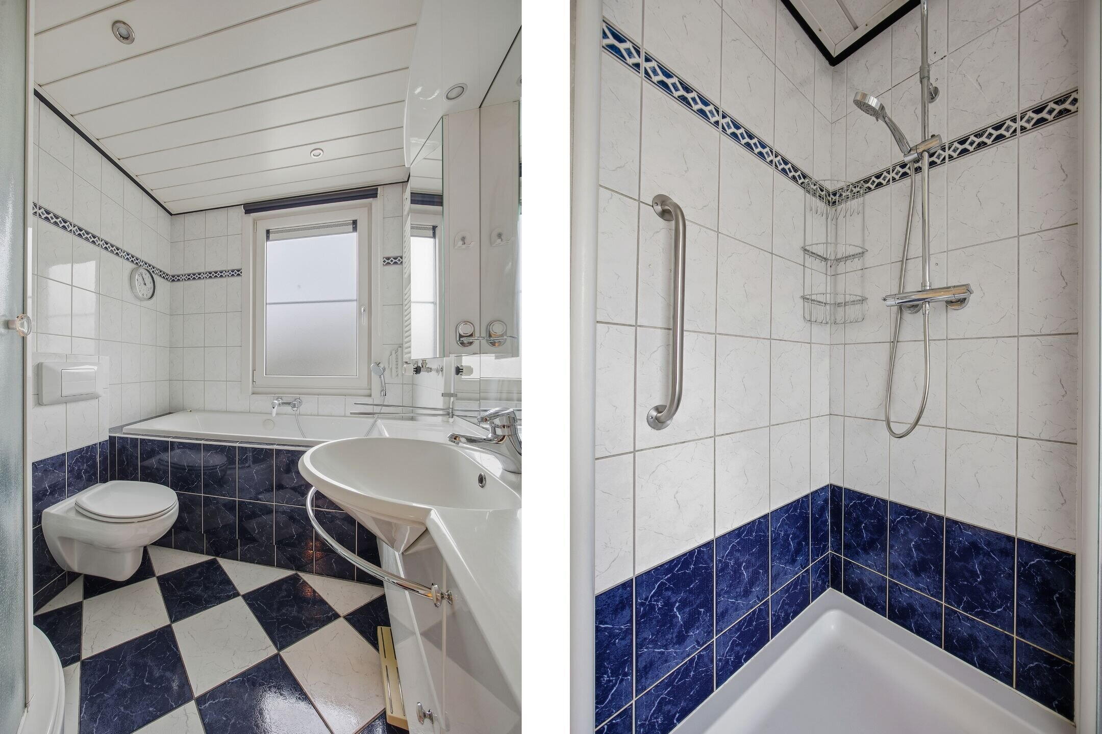 De badkamer is compleet uitgevoerd met een ligbad, douche, toilet en een wastafel met meubel en beschikt over natuurlijke ventilatie.